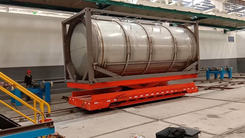 十字交叉平移換軌地平車可以在交叉軌道上運行。車身的換軌控制模塊與車身之間通過轉(zhuǎn)動換向裝置進行聯(lián)動。當交叉軌道車需要換軌時,通過驅(qū)動提升裝置將車體提升,使一套車輪離開軌道,另外一套車輪接觸交叉中的另外一條軌道,在另外一組軌道上找到定位,使車輪受力,達到換至軌道運行方向的目的。整個換軌過程耗時短,效率高,解決了軌道轉(zhuǎn)運車直角轉(zhuǎn)彎的難題。