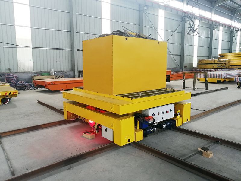 在現(xiàn)在的自動化生產(chǎn)車間,常常會見到很多的交叉軌道,這樣的交叉軌道不只是讓不同軌道上的車輛各自行走,還要求不用的軌道之間互相交換,來實現(xiàn)不同軌道上的車輛將物件運輸?shù)浇徊孳壍赖墓ぷ魑恢蒙?,針對這種工況,百分百公司設(shè)計了十字交叉平移換軌地平車。
